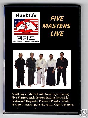 FIVE MASTERS LIVE DVD Another Great AMERICAN HAPKIDO FEDERATION event bringing together Five Masters demonstrating their style and approach to training. A great day of street level self-defense. This years event featured "Multiple Attacker Scenarios" (where putting your back on the ground, lengthy finish techniques or flashy throws are useless). Pressure Points, Directional Defense (a study in the direction to take your attacker in a multiple attacker scenario). Torite-Jutsu (pressure point concepts). Close Quarters Defensive Tactics, Advanced Traditional Bo Staff & Nunchaku training, Boxing footwork & punching strategies, Weapon Disarms, Incredible Tenshin Aikido! An awesome day of training for all who attended. This years event was filmed for DVD, three cameras present to record the entire event. The DVD features the entire training presentation of each Master. A full day of training techniques and concepts, nothing was editing, each Masters presentation was filmed in its entirety.